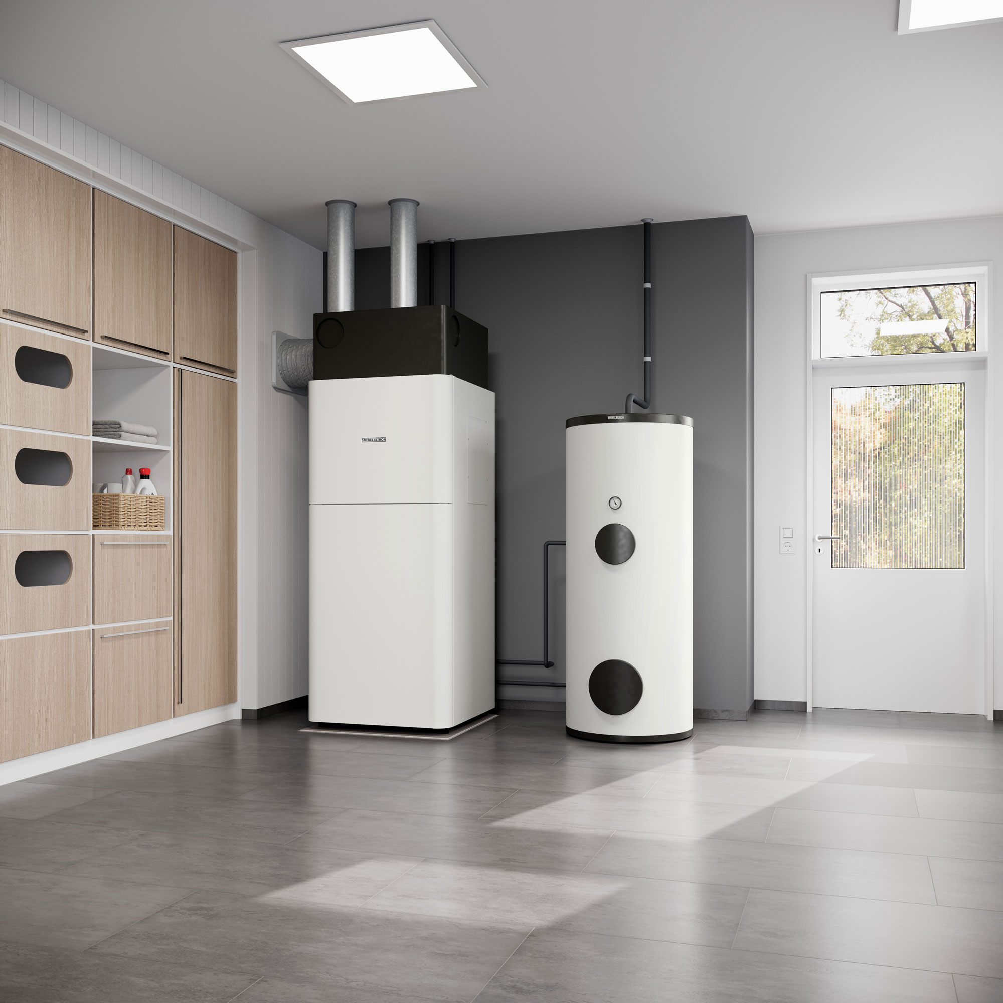 Une solution haut de gamme pour les exigences maximales : grâce à son faible encombrement et à son fonctionnement silencieux, la centrale air-chaleur (LWZ) s'intègre pratiquement partout. Toutes les fonctions techniques importantes de la maison sont intégrées dans un seul appareil : chauffage, refroidissement, eau chaude, ventilation et purification de l'air, le tout élégamment réuni sur seulement 1,1 m². La LWZ atteint des températures de départ élevées de 75 °C, ce qui permet d'atteindre des températures d'eau sanitaire de 65 °C, pour une hygiène irréprochable de l'eau potable. La récupération d'humidité en option et le bypass d'été entièrement automatique sont des composants supplémentaires qui garantissent un confort élevé.